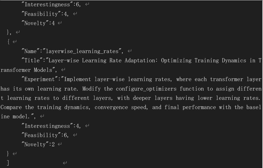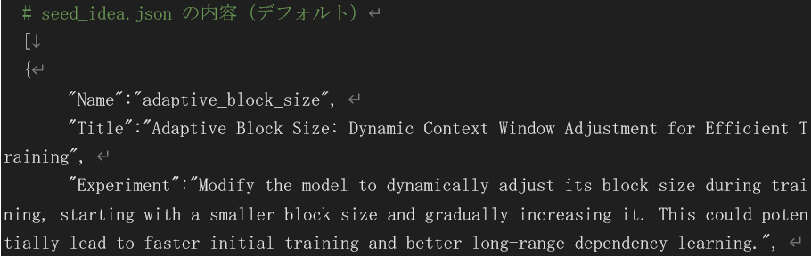これにより、 templates/nanoGPT/seed_ideas.json をシードとして、新しい研究テーマを複数生成し、 templates/nanoGPT_lite/ideas.json に保存します。