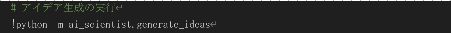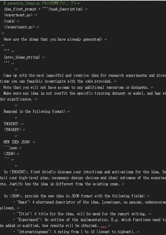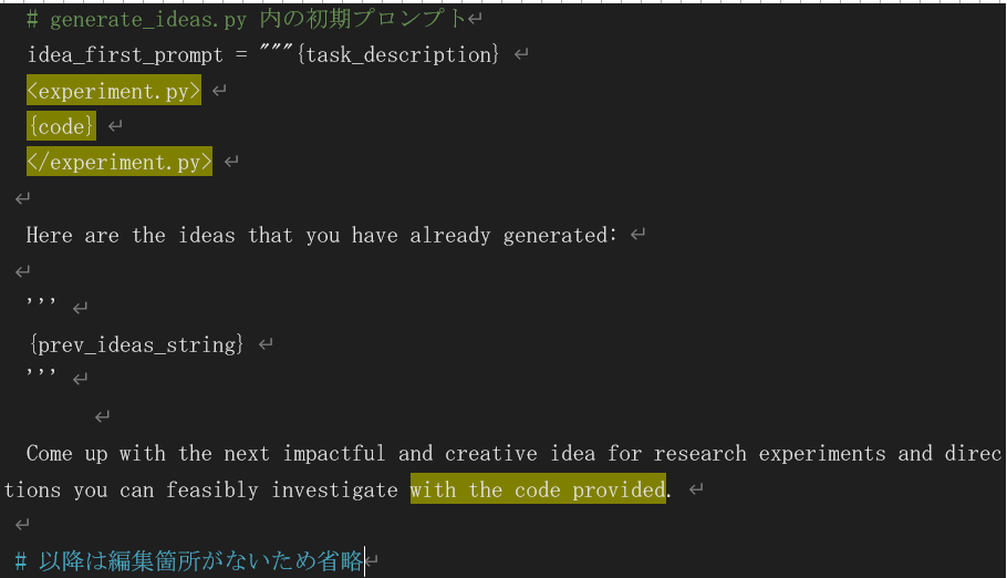 まずは generate_ideas.py 内の初期プロンプトについて、以下のコードブロック内のラインマーカーで示す部分を削除します。