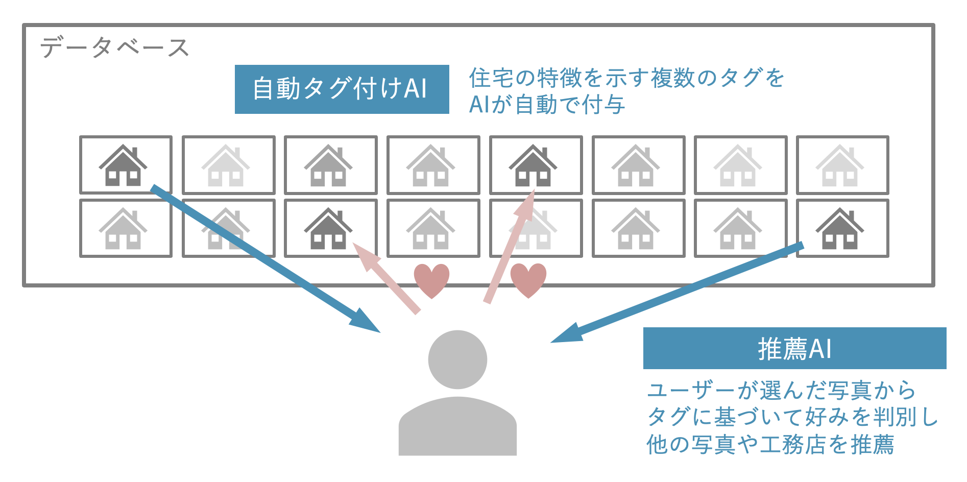 自動タグ付けAIは、住宅写真に対して「場所」「スタイル」「感情」等に関するタグを自動的に付与し、推薦AIはユーザーがサイト上で好きな住宅写真をいくつか選択すると、写真のタグを手がかりに、データベースの中からユーザーの好みに合いそうな住宅写真や工務店・建築家を推薦する。