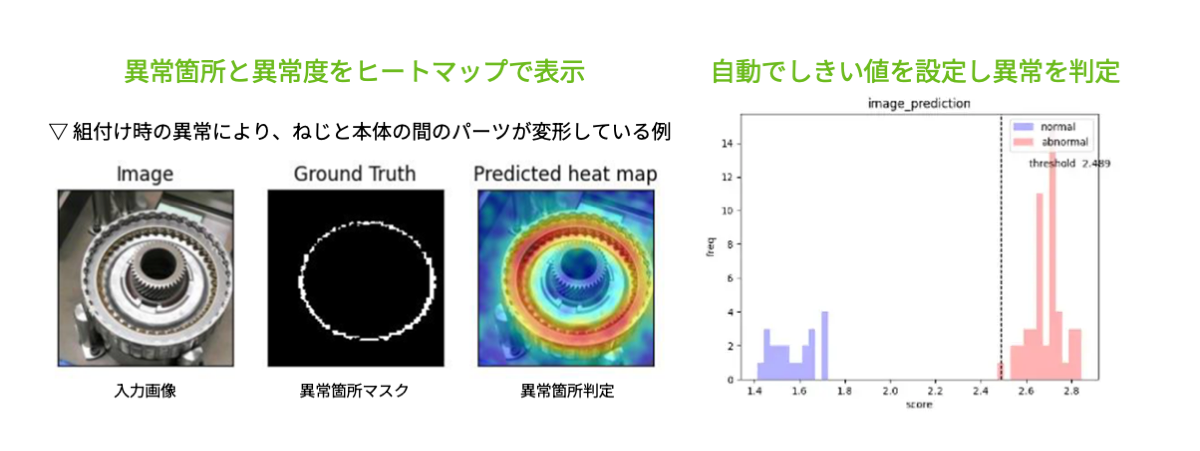 数十枚の良品画像の学習のみで高い異常検出精度をもつAIエンジンの開発に成功。学習データの不足という課題を解決するだけでなく、ケースによっては100%に近い検出精度が得られており、不良品の見逃しゼロにも貢献します。