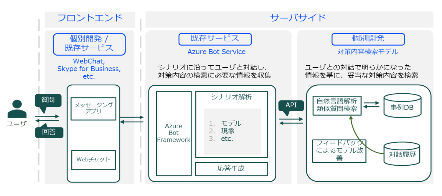 障害が起こった時、ヒアリングを行うオペレーターに代わり、AIが類似性の高い過去事例から有効な解決策を提示するチャットボットを開発。答えが出ない場合は、チャットに担当者を呼び出しその最終的な答えを次の学習データとして学ぶことにより、システムを使う度に精度が上がる仕組みを構築しました。これにより、人的リソースの削減、回答までの大幅な時間短縮など複数の課題が解決されました。