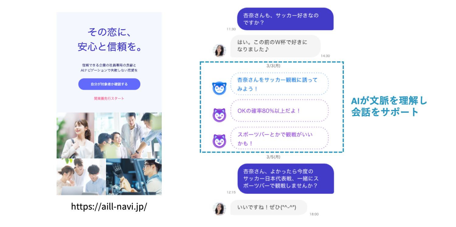 導入企業様では、一般的なマッチングアプリと異なり、異性間でメッセージをしている最中に、それまでの会話経緯やお互いの趣味嗜好を考慮しつつ、会話をナビゲートする専属のチームが二人の会話をアシストして、デートの約束をするまで適切なアドバイスをくれるというサービスを提供していました。