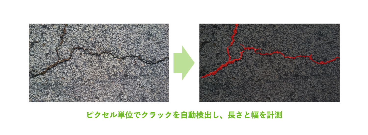 自動車等で壁面の動画を撮影し、画像を切り出してAIでクラックの長さと幅を自動検知することで、人手による現地調査の前段階での確認・検討が可能になりました。