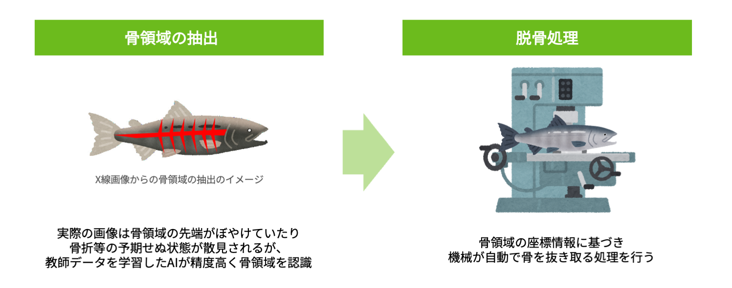豚バラ肉から肋骨を自動で脱骨する装置では、X線画像を用いて肋骨領域を認識し、座標情報に基づいて切断線を作成する処理が必要となります。しかし、実際のX線画像は骨領域の先端がぼやけていたり、骨折等の予期せぬ状態が散見されるため、従来のアルゴリズムベースの画像認識技術では実用に足る認識精度が得られず、実用化が困難となっていました。