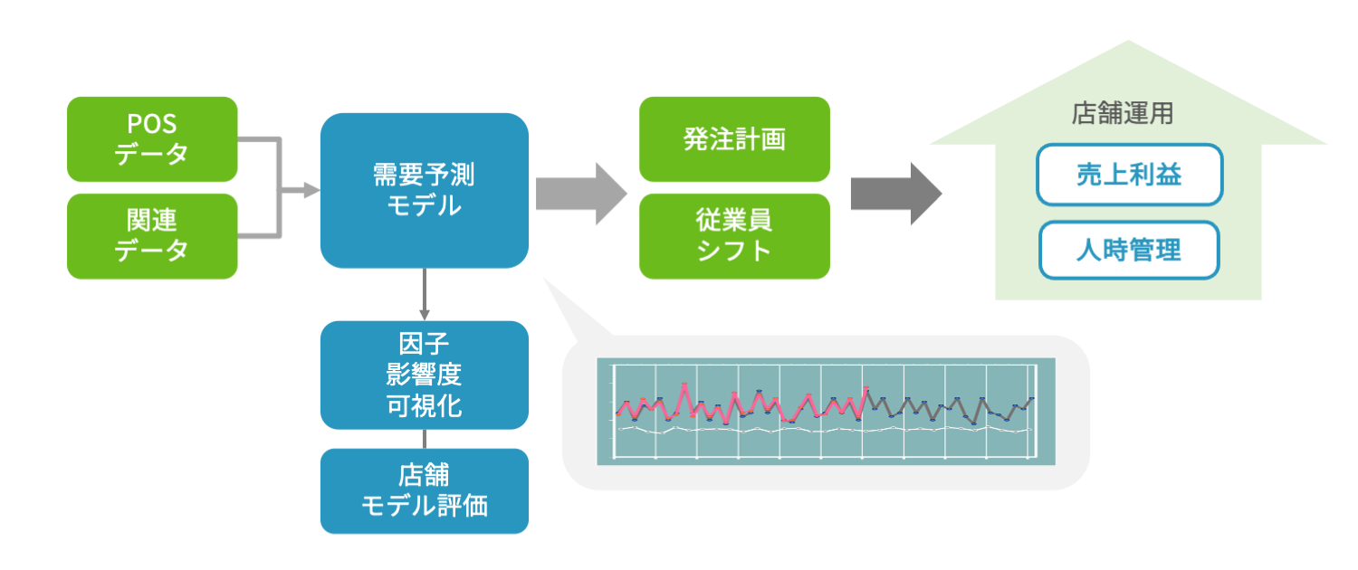 売上増減の因子を数値化した上で、時系列分析を用いて売上や購入客数等を日別・時間帯別に予測するAIを開発