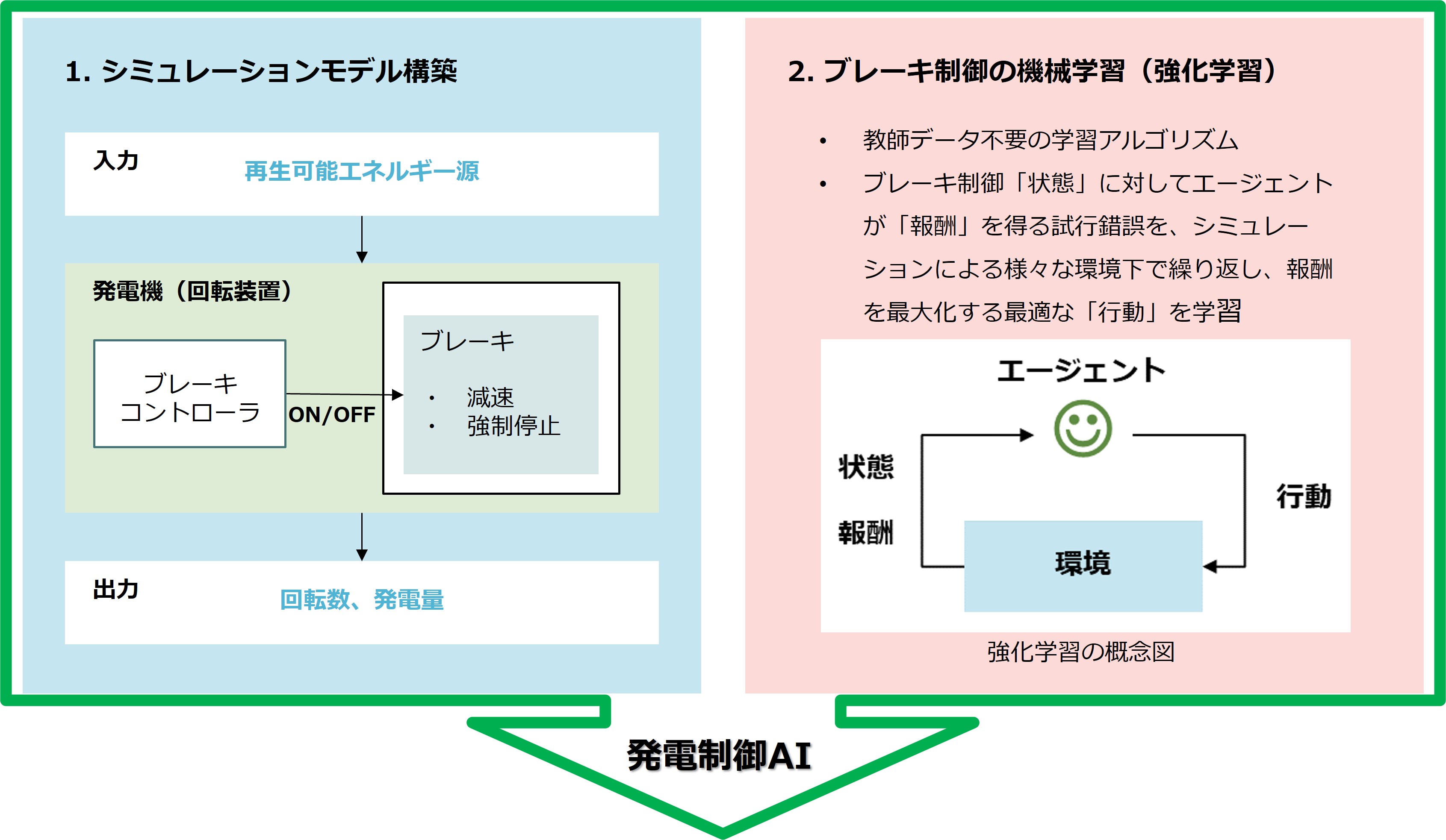 調和技研が開発したAIは、このブレーキ機能を最適に制御して発電量の無駄を最小化することで、よりサステナブルな発電を実現するものです(上図)。具体的には、発電機の回転数が限界を超えて強制停止しないよう、回転数をある程度保ったまま適切にブレーキをかけるための制御AIを開発しました。まず、実際の発電機の挙動を再現するためのシミュレーション環境を構築します。次に、その環境条件下で、「強化学習」というAIエージェントが試行錯誤によって自ら学習していくアルゴリズムを適用し、最適なブレーキ制御を学習させます。この強化学習は、教師データを必要としない学習アルゴリズムであり、実際の自然環境のように次の時間に発電機へ流入する自然エネルギー量が予測できない場合に特に有効です。