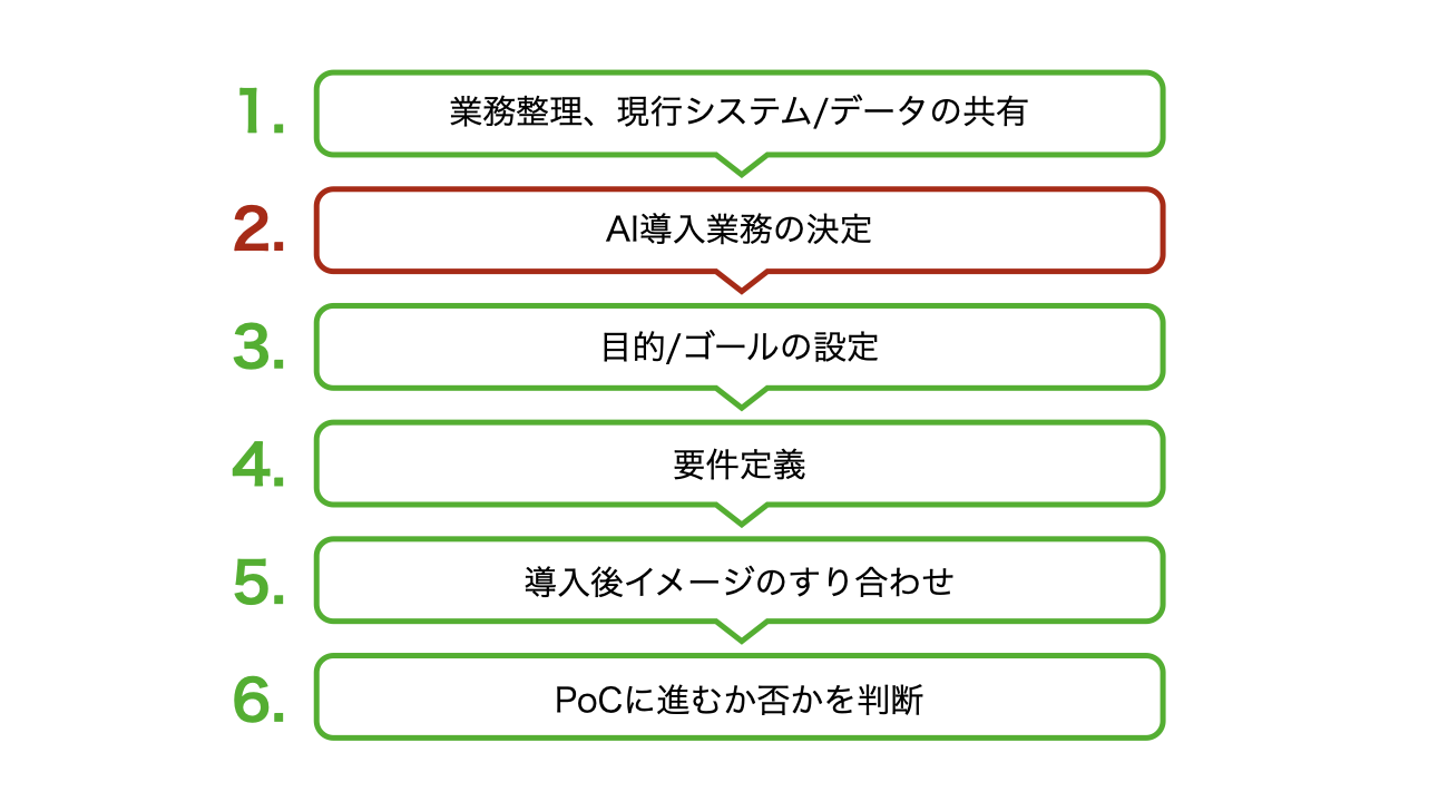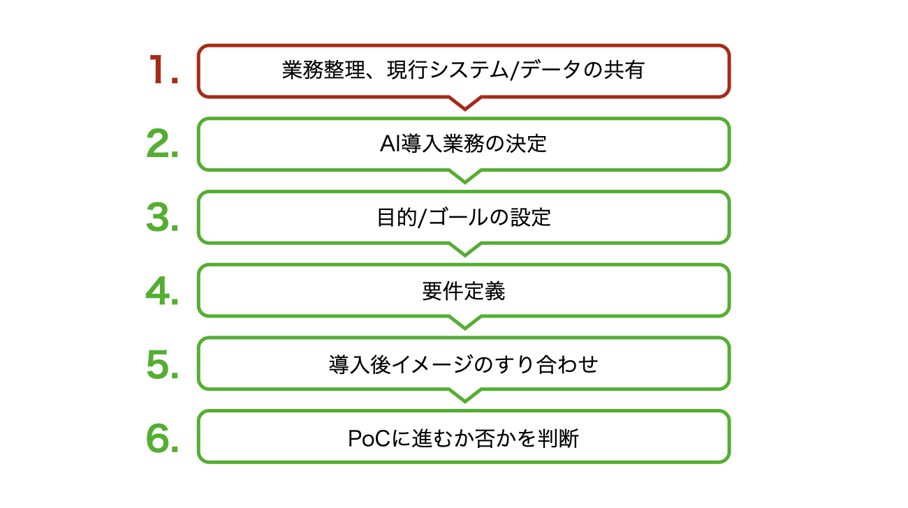 まずは基本的なAI導入アセスメントの進め方を把握しましょう。下図の順番に沿って説明していきます。