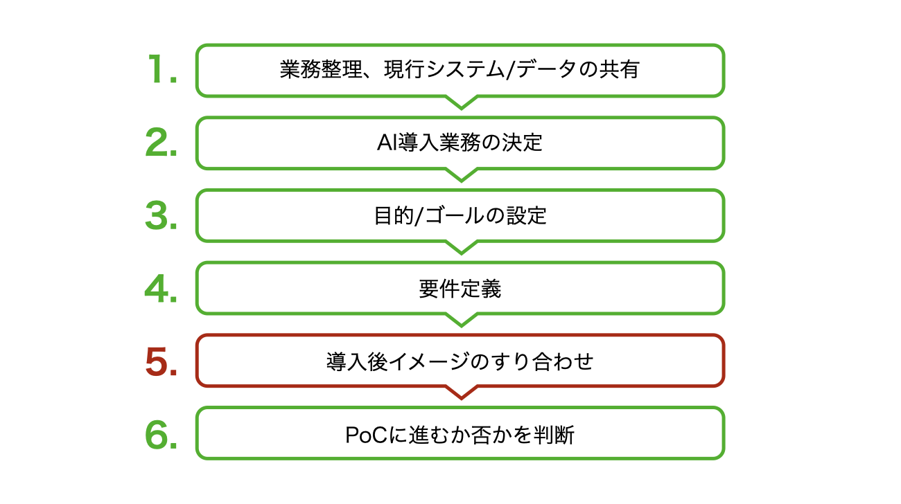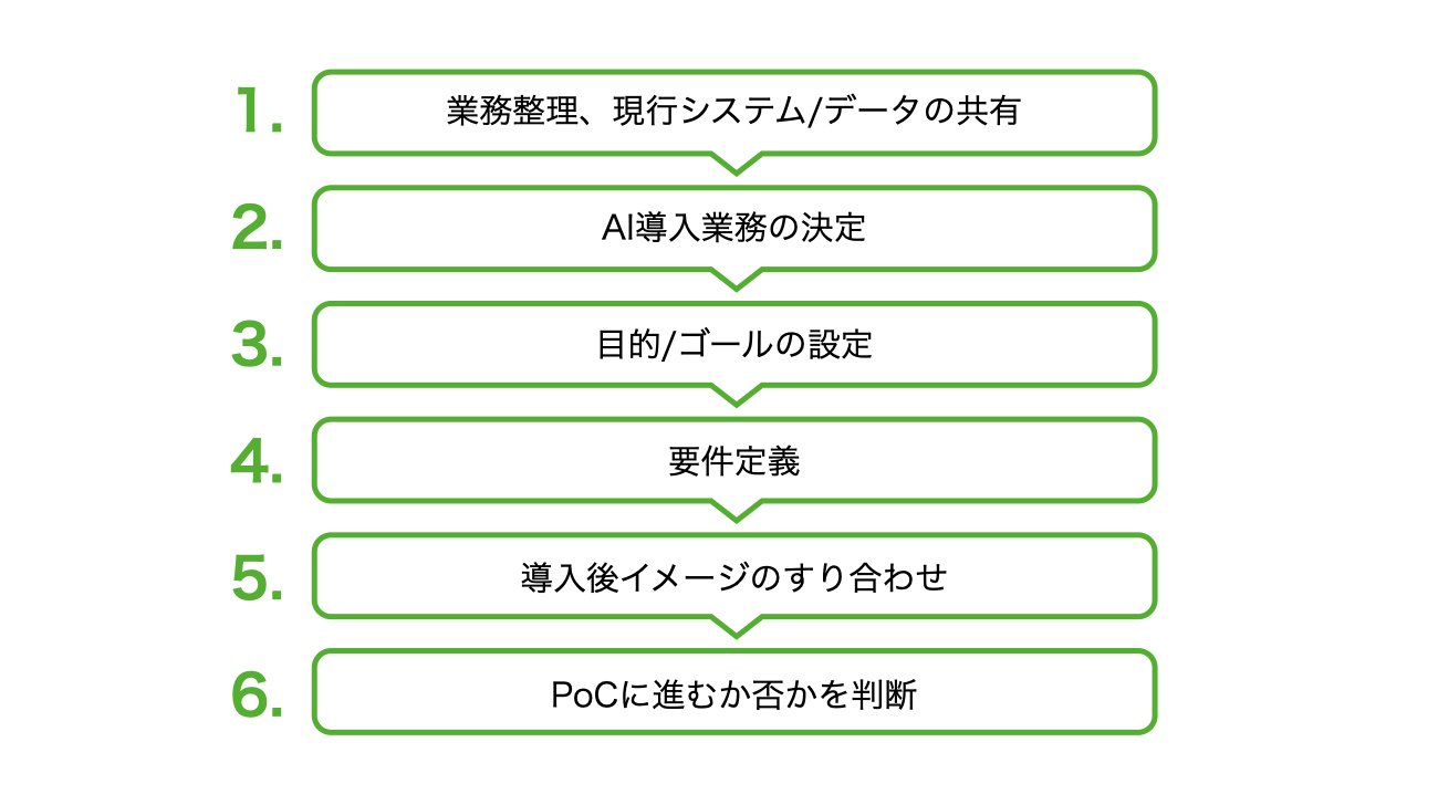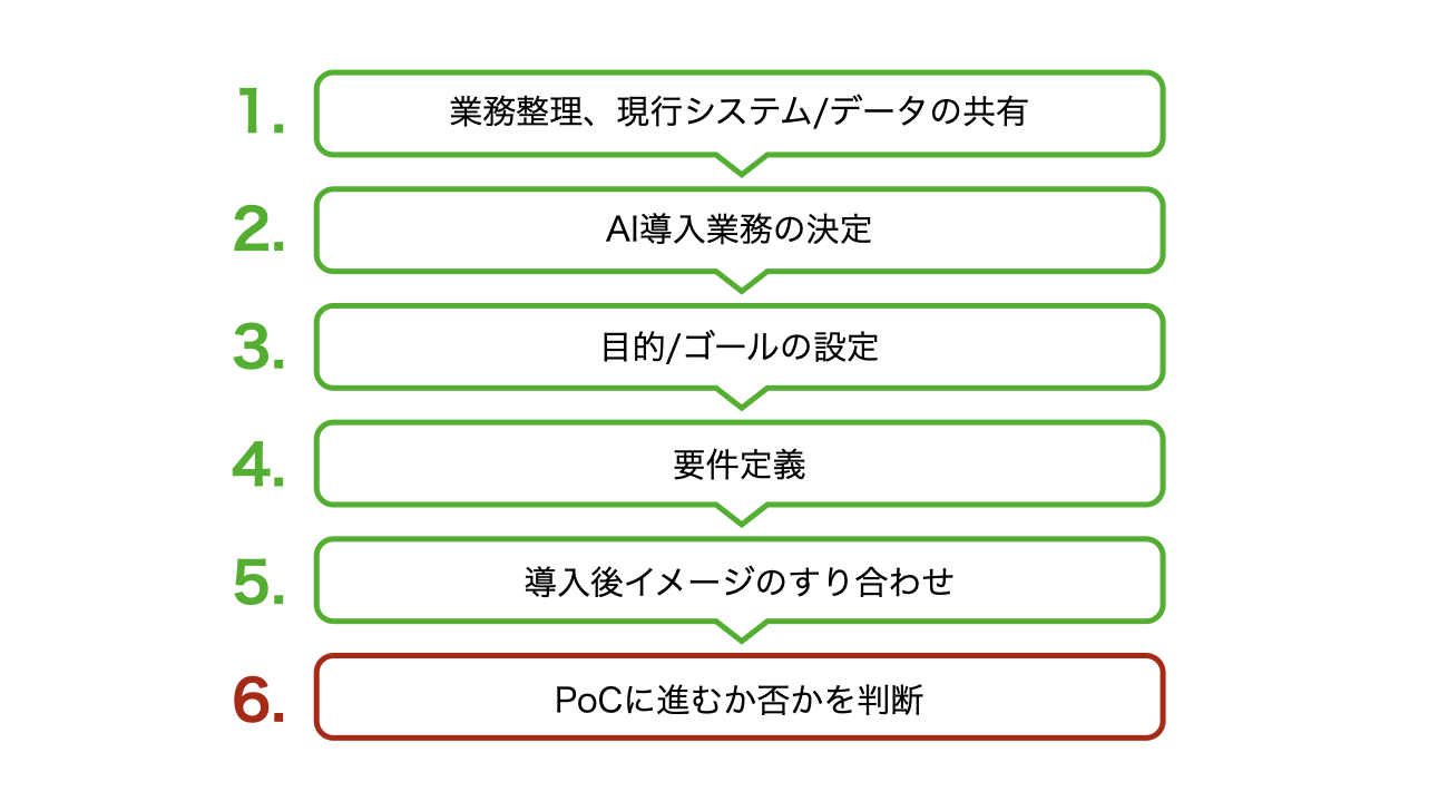 最後のステップでは、PoC(Proof of Concept:概念実証。作成予定のAIが実現可能かを確認する検証作業)に進むかどうかを検討します。本格的なAIの開発は、PoC期間を経た後に改めて開発要否を判断するケースが多いです。