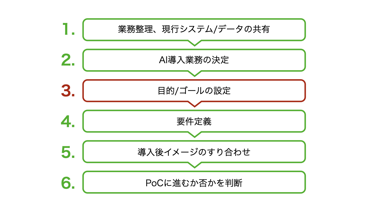 AIの導入は業務の変化も伴う大きな投資です。どの効果基準、目標をどの程度クリアできる見込みであればAI導入に向けて進められるか、明確な判断基準を設定したうえで判断できると後続のPoC作業もスムーズに行えます。
