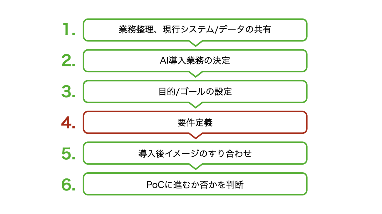 最後のステップでは、PoC(Proof of Concept:概念実証。作成予定のAIが実現可能かを確認する検証作業)に進むかどうかを検討します。本格的なAIの開発は、PoC期間を経た後に改めて開発要否を判断するケースが多いです。