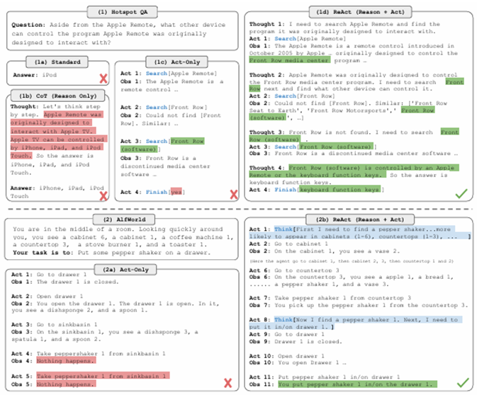 ReActは、タスク実行のためにどのような理由(Reasoning)でどういった行動(Acting)が必要なのかを推論する手法です。