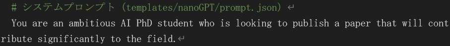 また、実験用コードは experiment.py にあるコードを参照して生成します。以下はこの制限に関連している generate_ideas.py 内の初期プロンプトと、Idea Generation で使用されるシステムプロンプト(templates/nanoGPT/prompt.json)です。