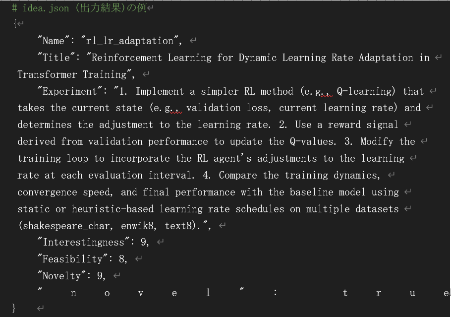 これにより、 templates/nanoGPT/seed_ideas.json をシードとして、新しい研究テーマを複数生成し、 templates/nanoGPT_lite/ideas.json に保存します。