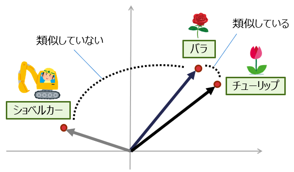 例えば「バラ」「チューリップ」というテキストを埋め込み表現にすると[0.34, -0.23, 0.75, …]、[0.35, -0.10, 0.68, …]のように実数値の配列に変換されます。それぞれの近さは、コサイン類似度などを用いて評価され、「“バラ”, “チューリップ”」と「“バラ”, “ショベルカー”」では前者のほうが近くなり、単語の意味の近さを反映しています。このようにベクトル検索は、文章の意味を考慮した検索に対応できるところが全文検索とは異なっています。