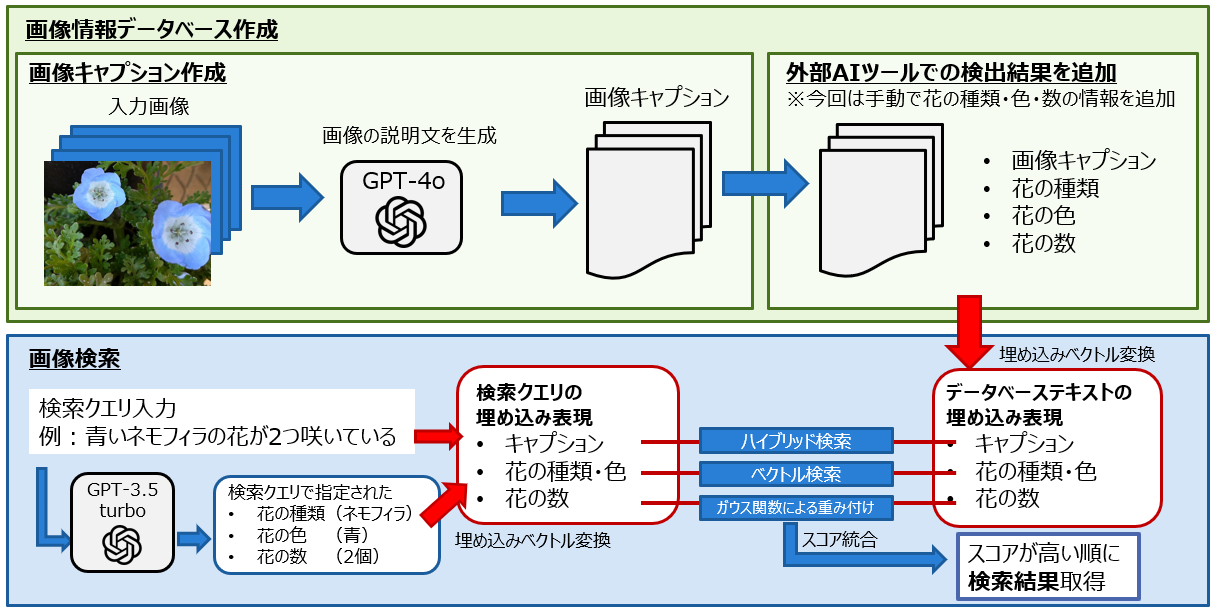 はじめに、手持ちの画像に対してGPT-4oを用いて画像キャプションを含む画像情報データベースを作成しました。次に、花の種類などの新しい項目を追加してデータベースに情報を入力しました。物体検出などの他のAIツールを用いて得た精度の高い結果を追加することで検索精度が向上すると期待されますが、今回は手作業で入力しました。最後に、作成した画像情報データベースに対して、ベクトル検索・ハイブリッド検索を用いて検索クエリに近い画像を得られるようにしました。