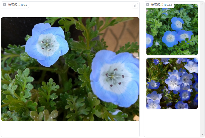 上の画面には「ネモフィラの花が2つ咲いている」という検索クエリを入力した場合の結果が表示されています。最も大きく表示されている画像はネモフィラの花が2つ咲いている画像なので正しい結果といえます。スコアが2, 3番目の画像も、近い数のネモフィラの花が表示されています。以下に検索結果のみを切り抜いた画像を載せています。