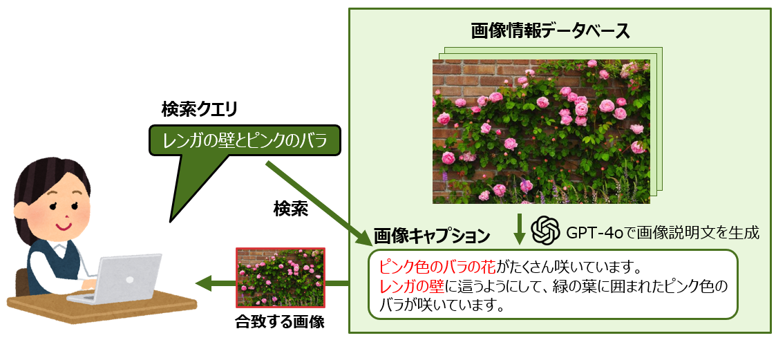 このシステムは、「花が川辺で数本揺れている」「レンガの壁とピンクのバラ」のように文章や単語(検索クエリ)を入力して検索する形式で、特定のカテゴリとして登録されていない情報や曖昧な表現・表記揺れにも対応できるようにします。これにより、事前に設定されたカテゴリから選択して検索する方法に比べて、用途が広がり便利に使えると期待されます。