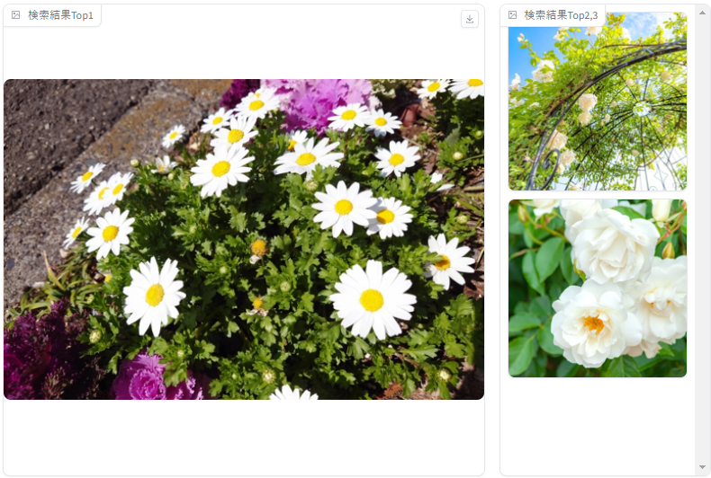 つぎに、「アスファルトの上に白い花が咲いている」と入力して検索してみます。