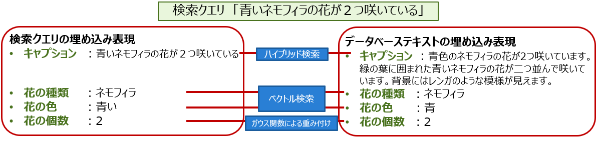 次に、埋め込み表現に変換した後、これらの項目ごとにデータベースに保存されている項目と比較します。文字列の比較の場合、検索クエリとデータベースのテキストを埋め込み表現にして、ベクトル検索(コサイン類似度)のスコアを算出します。例えば「花の色」の比較では、検索クエリに「青い」と入力された場合、データベースが「青」となっていれば高いスコアを出し、「赤」となっていれば低いスコアを出します。