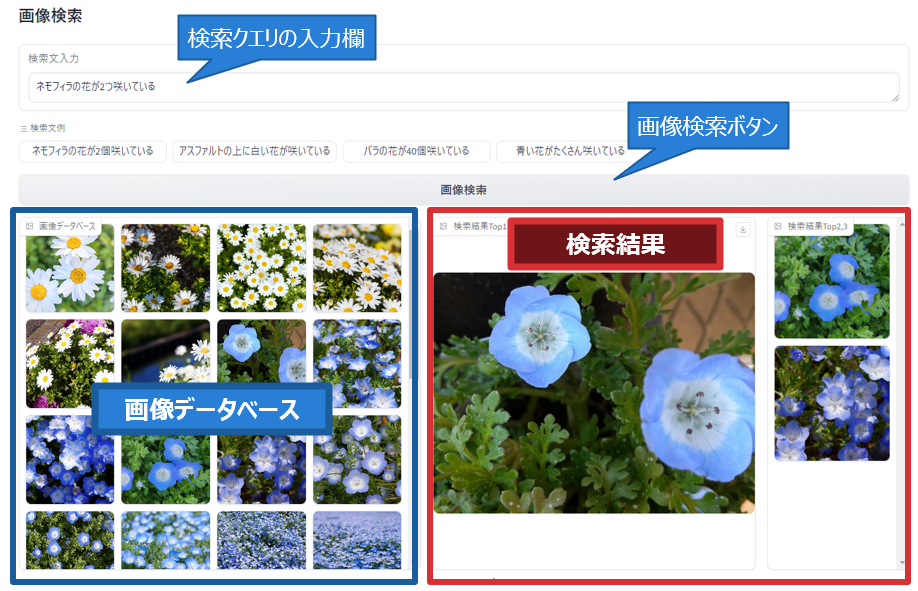 「画像検索」では、検索文の埋め込み表現と、データベース内のテキストの埋め込み表現に対してハイブリッド検索などの文書検索手法を用いて、検索クエリに近い画像を探します。