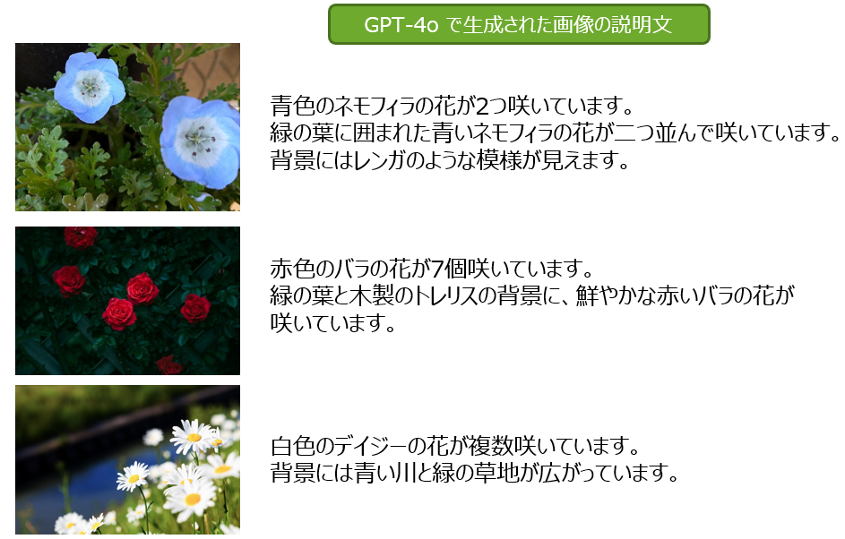 花の数については、数が多くなるにつれて多少の間違いはあるものの、実際の個数に近い数を含む文章が生成されています。10輪以上になると「複数」「たくさん」などの語彙で出力されることが多いようです。背景情報についても読み取って文章化されています。