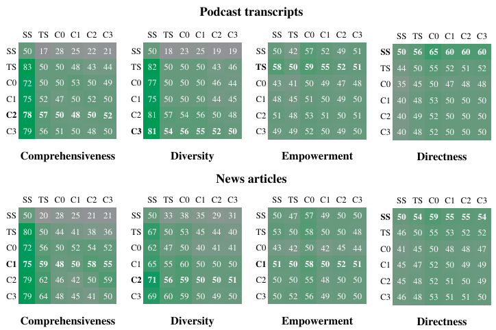 Microsoft Researchチームによって、GraphRAG(C0〜C3)の性能について従来のRAG手法(SS)やテキスト要約手法(TS)との比較が行われています。C0~C3の4つのGraphRAG手法はそれぞれクエリ生成に用いるコミュニティ要約が異なり、続く数字が大きくなるにつれてコミュニティ要約のコンテキストウィンドウサイズが大きくなります。評価は包括性(Comprehensiveness:質問の暗黙の文脈の枠組みの中での完全性)、多様性(Diversity:提起された質問に対する異なる視点や角度の提供)、エンパワーメント(Empowerment:裏付けとなるソース資料やその他の文脈情報の提供)、直接性(Directness)を指標としており、各観点において片方の手法の回答よりも優れているとSelfCheckGPT[2]によって判断された回数が表に示されています。結果として、包括性及び多様性においてGraphRAG手法が従来手法に比べて優れたパフォーマンスが得られることが示唆されています。
