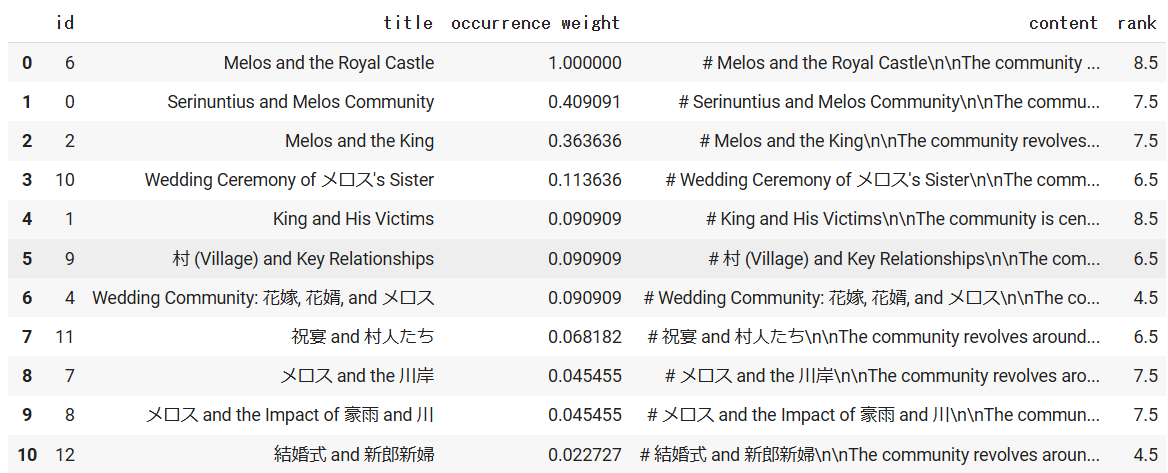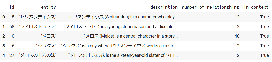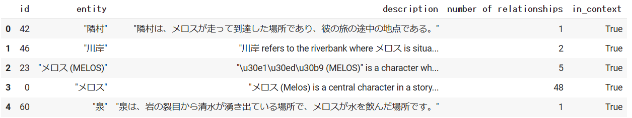 どちらの手法においても「メロスとセリヌンティウスが友人関係である」のような二人の関係性について説明できており、Langchain+Neo4jの方法に比べて詳細に述べられていることがわかります。Langchain+Neo4jではCypherクエリが単一であり一つのエンティティの組のみが参照されているのに対して、MicrosoftのGraphRAGでは様々なEntityやRelationshipが参照されています。