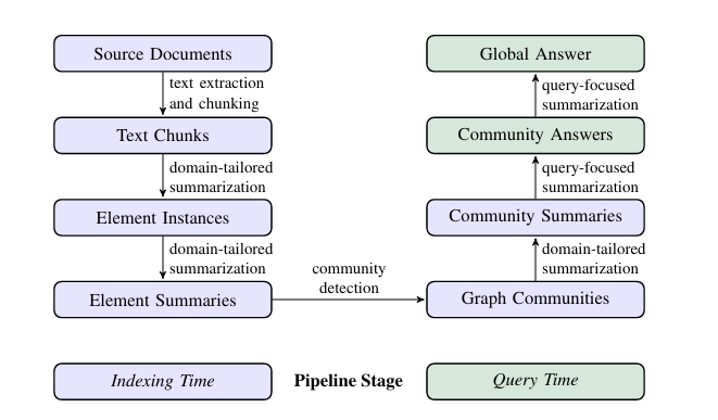 - 知識グラフのコミュニティ要約を事前に生成し、これをもとに応答する