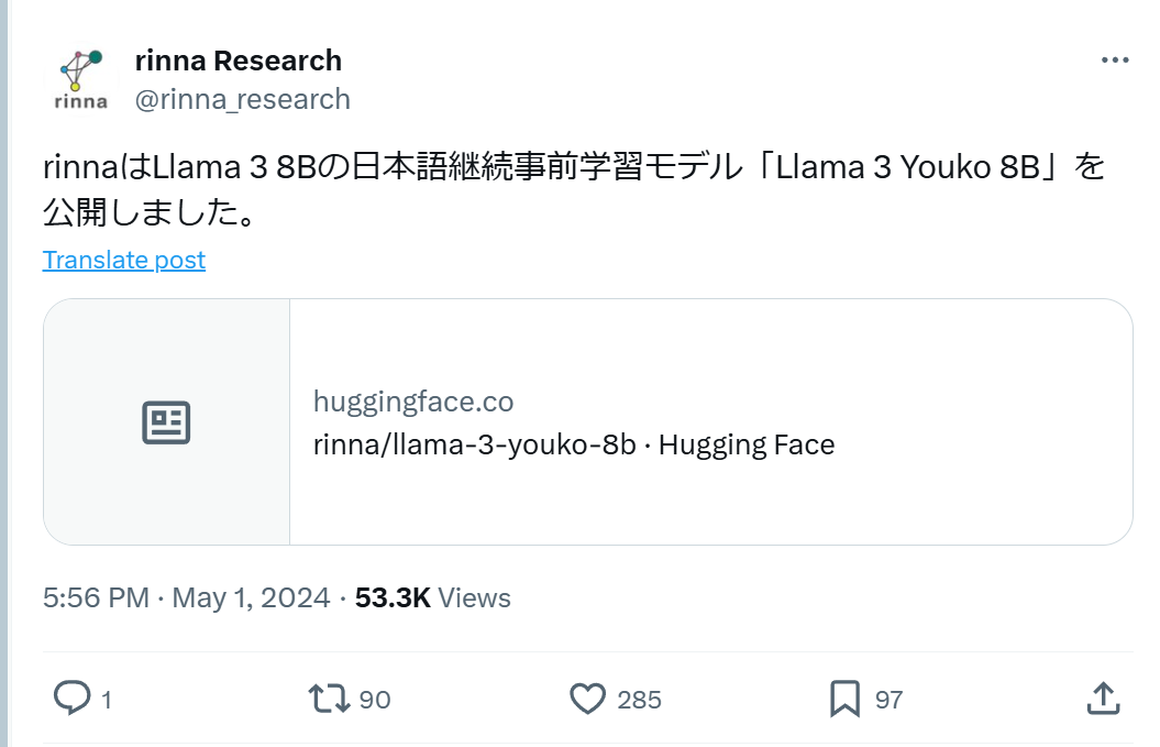 https://x.com/rinna_research/status/1785594024122003786[1]