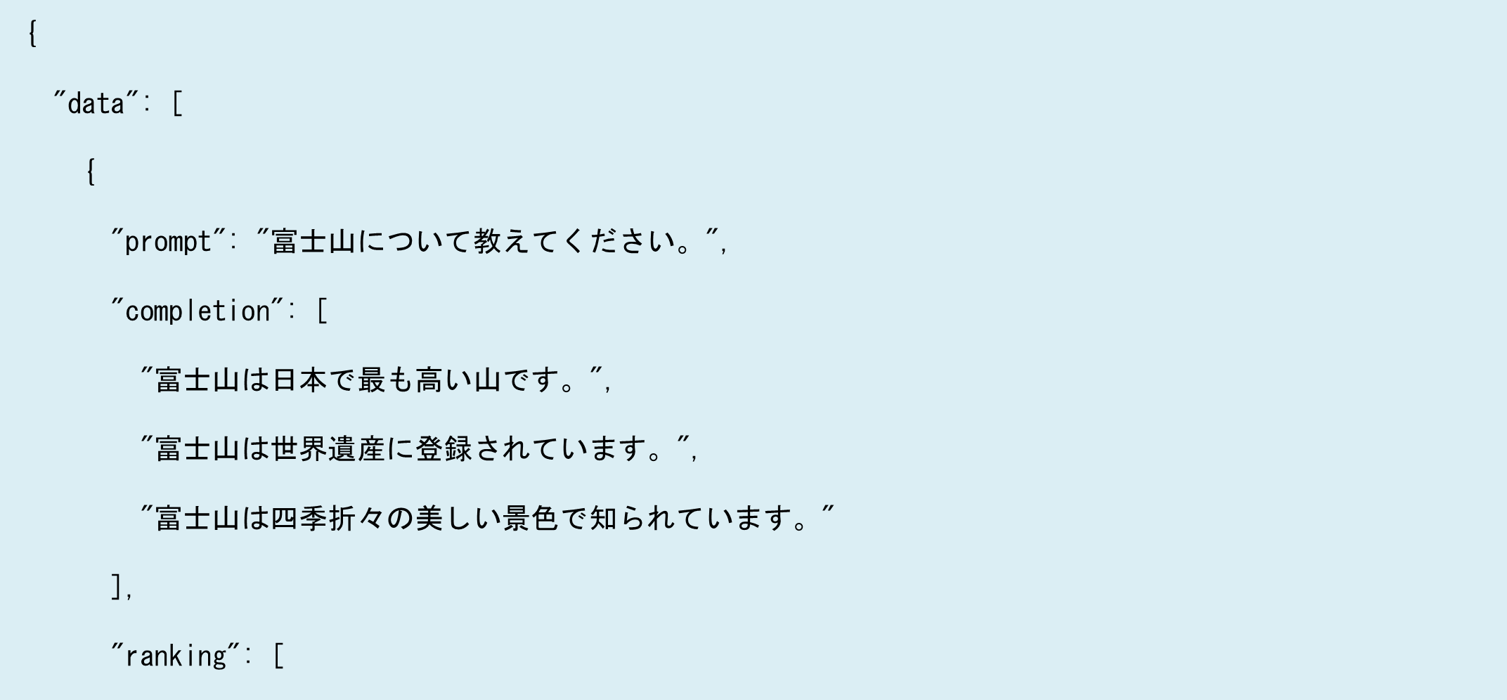 報酬モデルデータセットは、「プロンプト、複数の回答、そしてそれらの回答に対するランク付け」という情報で構成されています。例えば「富士山について教えてください」というプロンプトに対して、以下のような回答が生成されたとします。