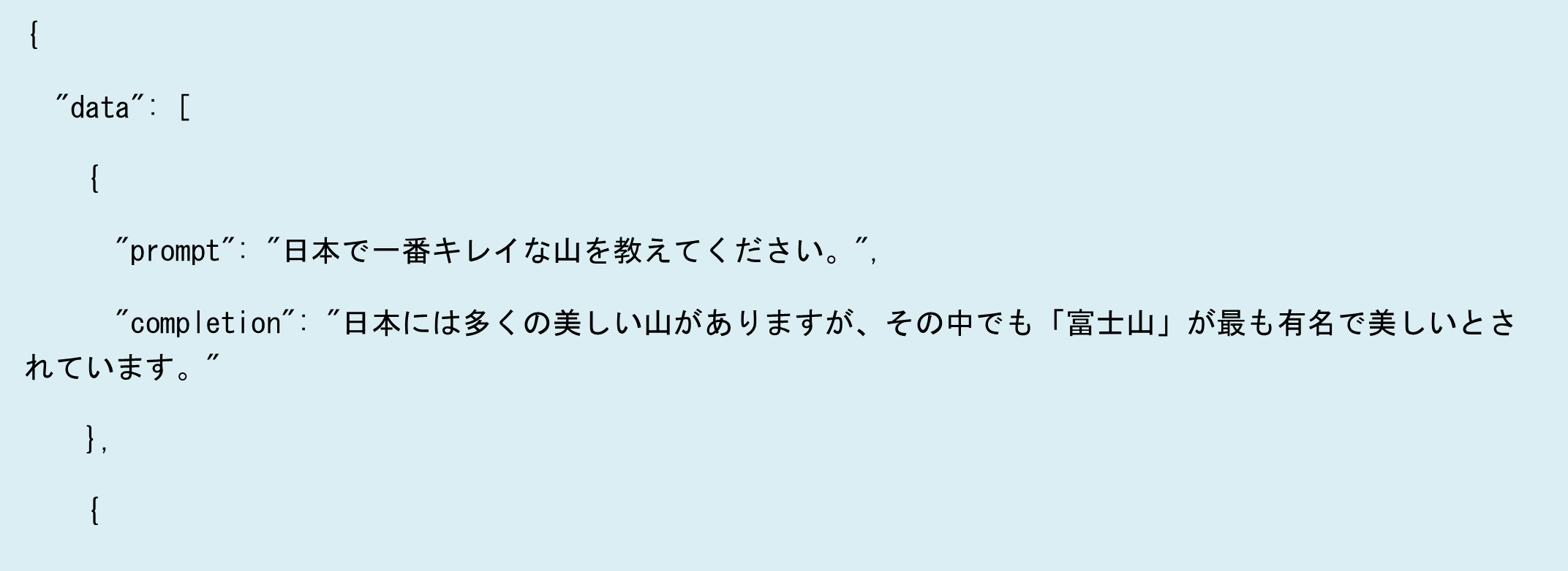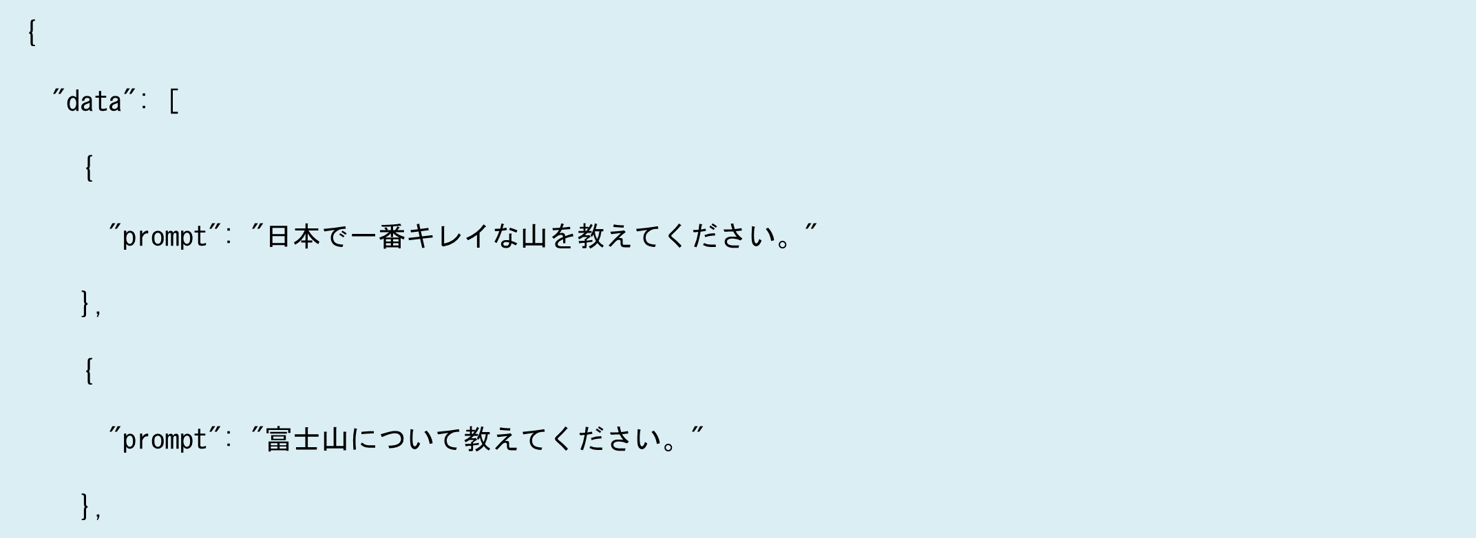- "prompt"フィールドには、質問や命令などのテキストデータが保存されます。
