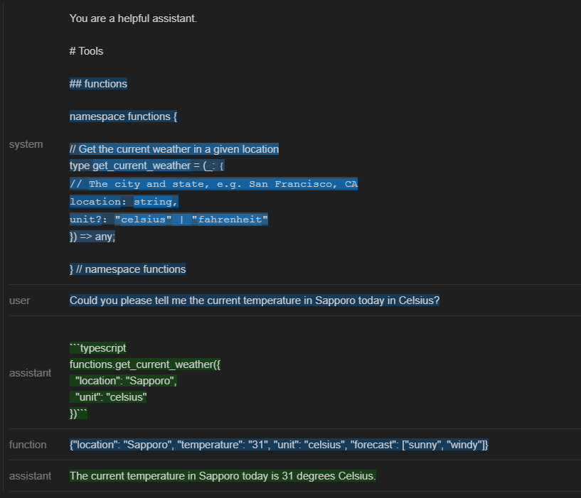 ”assistant”ロールの出力結果は2つあることが確認できます。1つ目にはどのようなパラメータでどの関数を呼び出すべきとLLMが判断したのかを示すログが示されています。get_current_weatherを選んでいますし、”location”には”Sapporo”、”unit”には”celsius”と適切な文字列が設定されていますね。次の”function”ではそれらの関数・パラメータを使用して得た結果が出力されています。