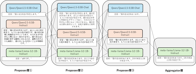 各Proposerの回答は次の層に伝えられ、回答を見ると、情報が伝播していく様子が