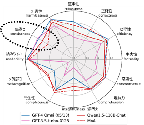 知」で上回りました。ただし、MoAは「簡潔さ」のスコアが低く、LLM単体より冗長な