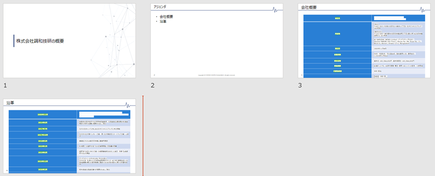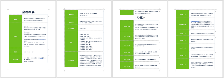 なんとアジェンダまで作ってくれた上、表形式で会社概要と沿革をまとめてくれています。