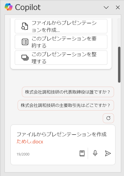 その後、Copilotを立ち上げると、下記の画像のように「ファイルからプレゼンテーションを作成」という選択肢が表示されます。