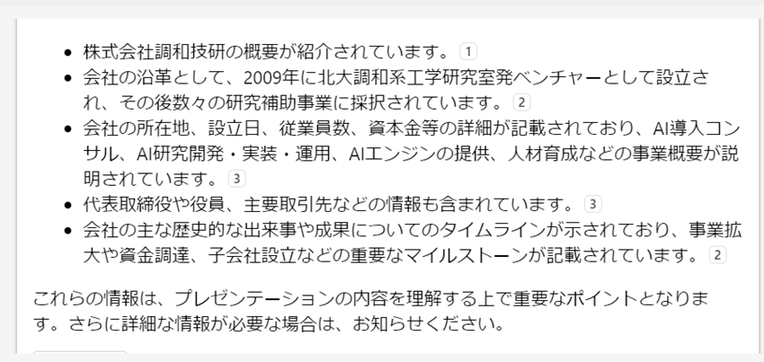 Copilotにテスト2で作成したプレゼンテーションを要約してもらった時の結果は以下のようになりました。