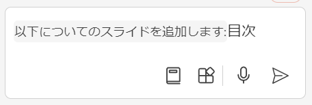「以下についてスライドを追加:目次」と指示することで、Copilotが目次スライドを