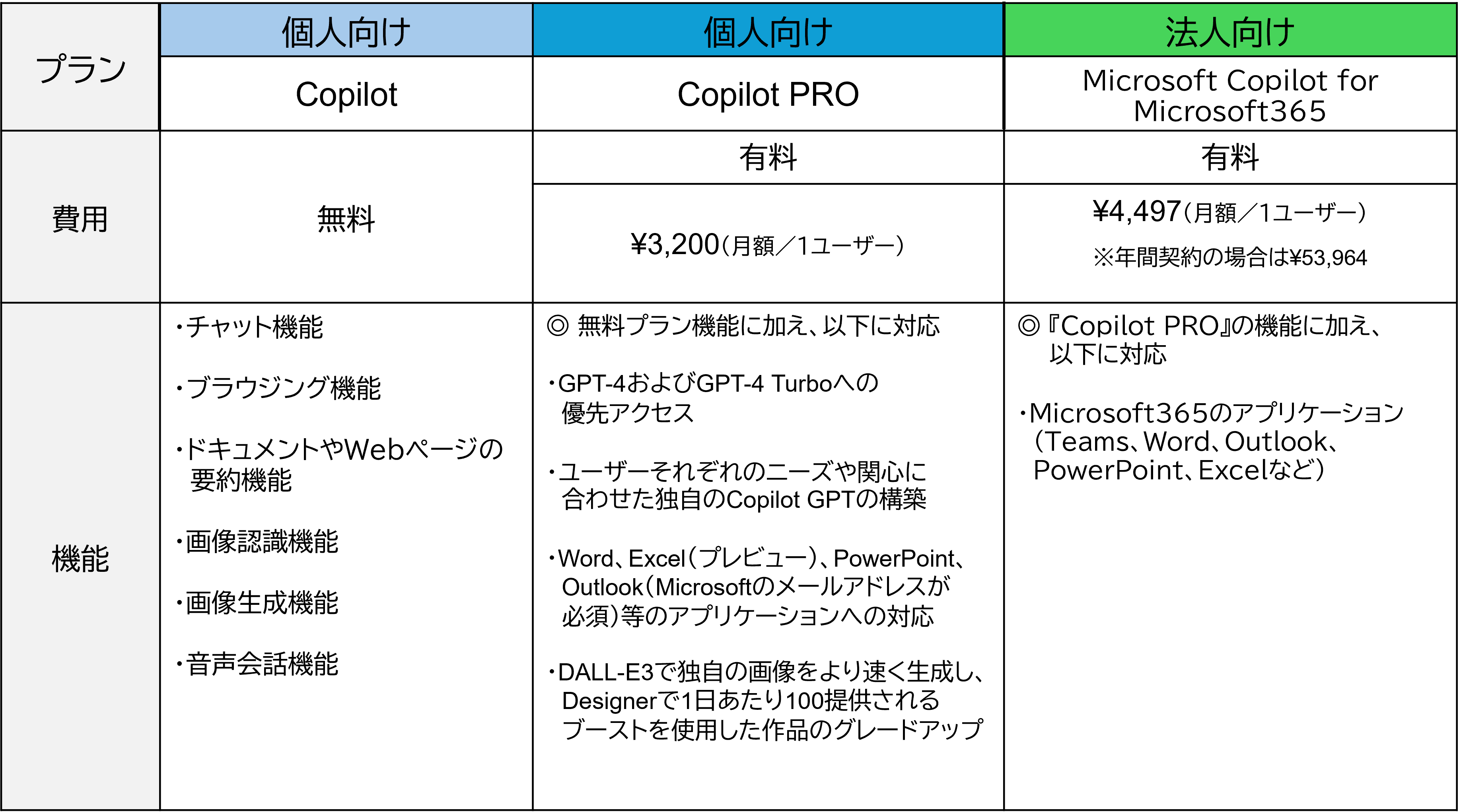 以下の表に、Microsoft Copilotの各プランとその内容をまとめました。利用目的に応じて、適切なプランを選択してください。