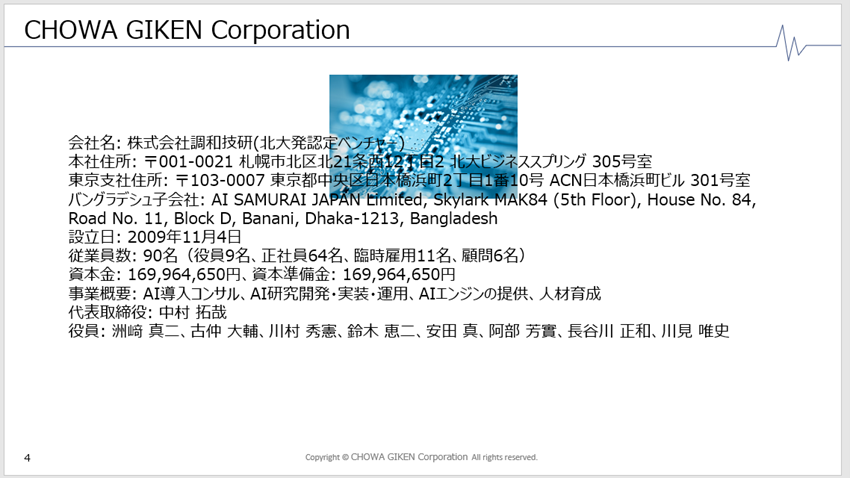 - 会社の所在地、設立日、従業員数、資本金等の詳細が記載されており、AI導入コンサル、AI研究開発・実装・運用、AIエンジンの提供、人材育成などの事業概要が説明されています。③