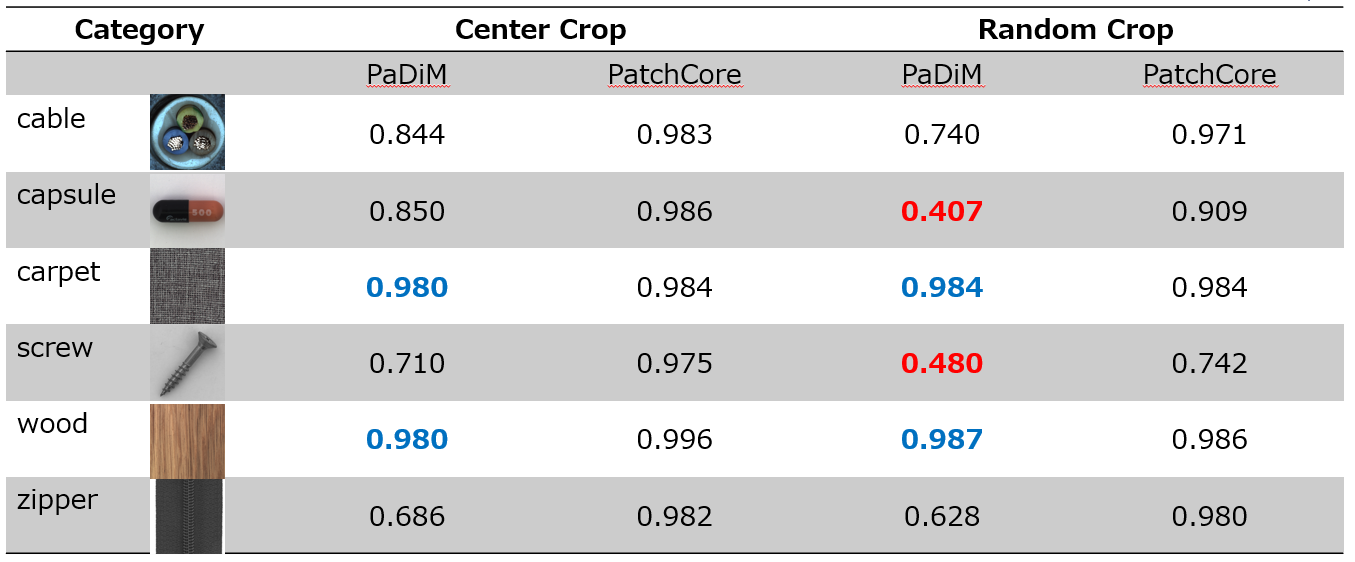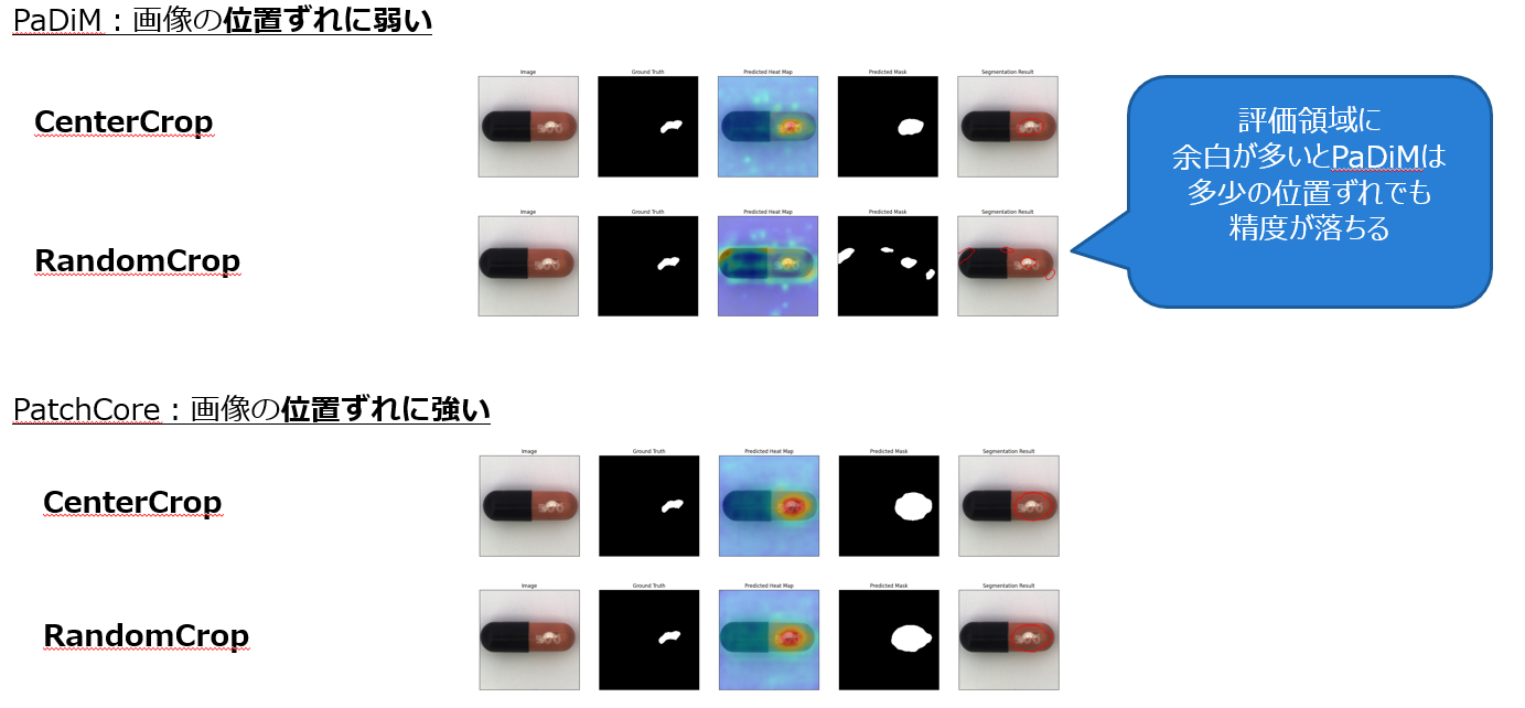 - 学習画像が位置ずれをしていない場合、PaDiMの出力結果は位置ずれのないCenterCropの画像について高い性能を示している。一方、位置ずれをしたRandomCrop画像に関しては、多くの領域を誤検出している。