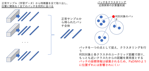 正常画像から得たパッチをクラスタリングし、推論時には各クラスタの中心からどの程度乖離しているのかを計測します。ImageNetの学習済みモデルを用いて入力画像からパッチを計算します。その後、正常画像から抽出したパッチを多次元空間の中の一つの点として捉えてクラスタリングを行い、その結果をメモリバンクとして保持します。推論時には、推論画像から得られたパッチと最も近いクラスタの代表値の間のユークリッド距離を異常スコアとしています。