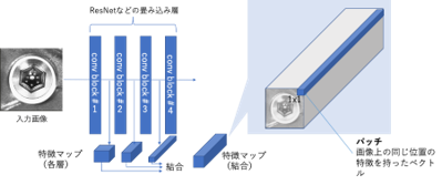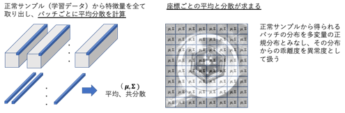 PaDiM(パディム)*[1]は、2020年11月に発表された異常検知のための機械学習モデルです。PaDiMは、ImageNetの学習済みモデルに画像を入力して特徴を抽出した後、複数の層の特徴を結合してパッチを計算をします。このとき、複数の層から出力された特徴を組み合わせており、大きさの異なる欠陥にも対応できるように工夫がされています。また学習時には、正常画像のパッチの各要素の平均と共分散を求めておき、推論時にはマハラノビス距離でパッチが正常の分布からどの程度乖離しているのかを計測して異常度をスコア化するアルゴリズムとなっています。