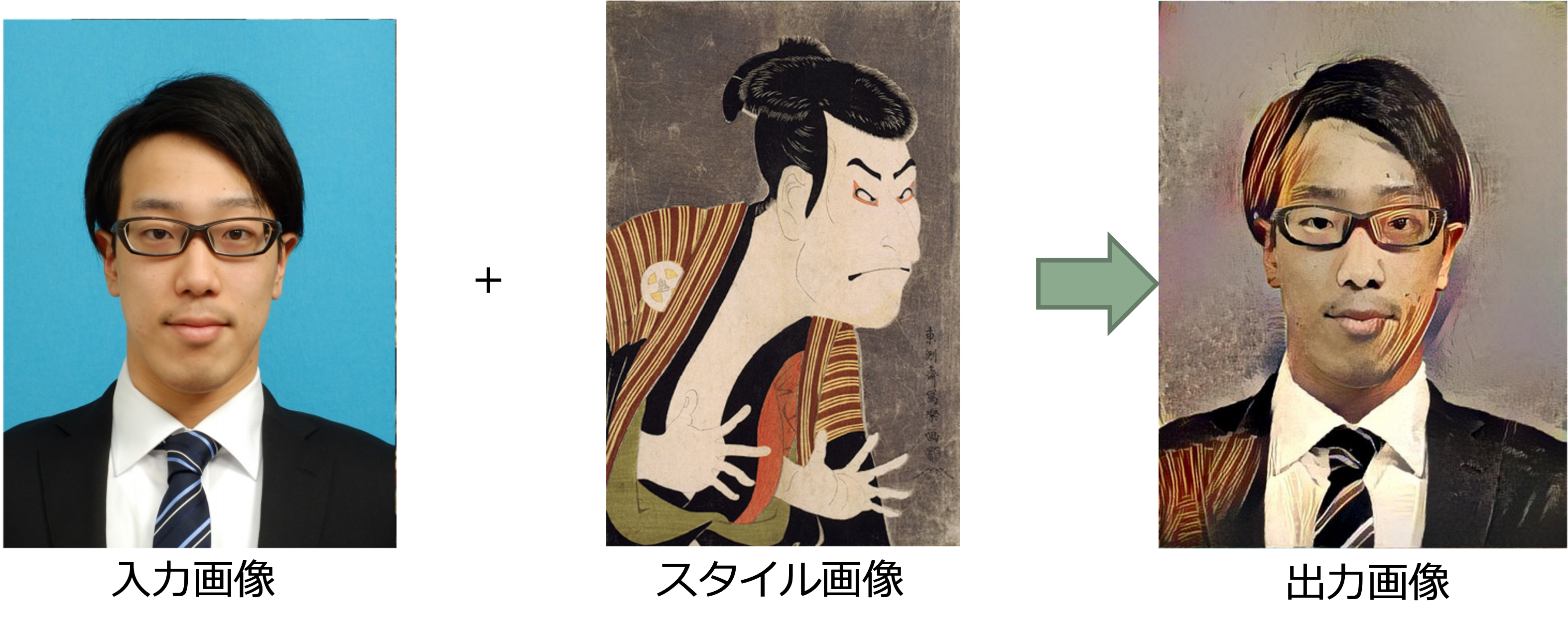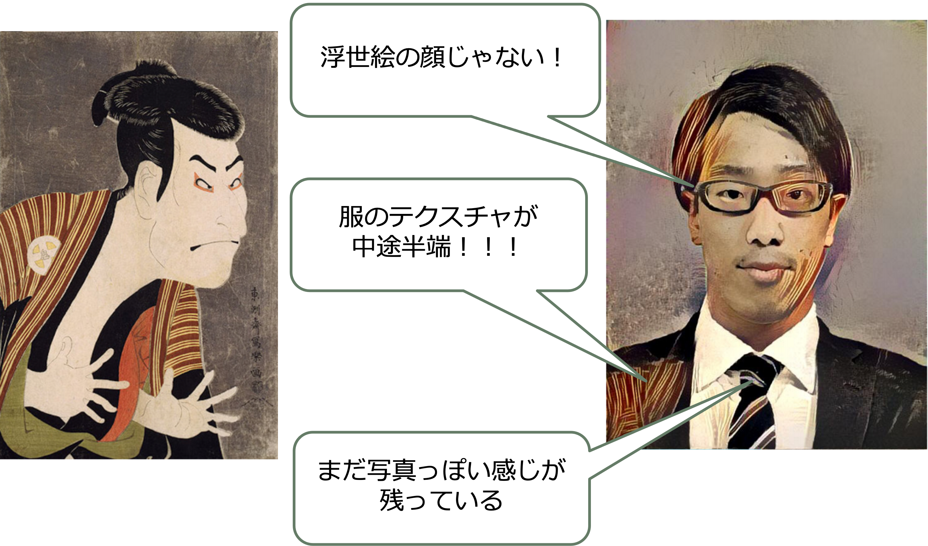 色々と試していくうちに、あらかじめ準備されているStyle画像として用いられるものが西洋画かつ油絵であることが多いことに気が付きました。浮世絵などの日本の芸術に対してあまり適用されている例がなかったため、浮世絵に変換するとどのような結果が得られるかを確認しました。画像は先ほどと同様に私の学生時代の履歴書の写真を用い、浮世絵側にはみなさんが一度は見たことがある東洲斎写楽の描いた三世大谷鬼次の奴江戸兵衛(さんせいおおたにおにじのやっこえどべえ)を用いて同様に変換を行いました。