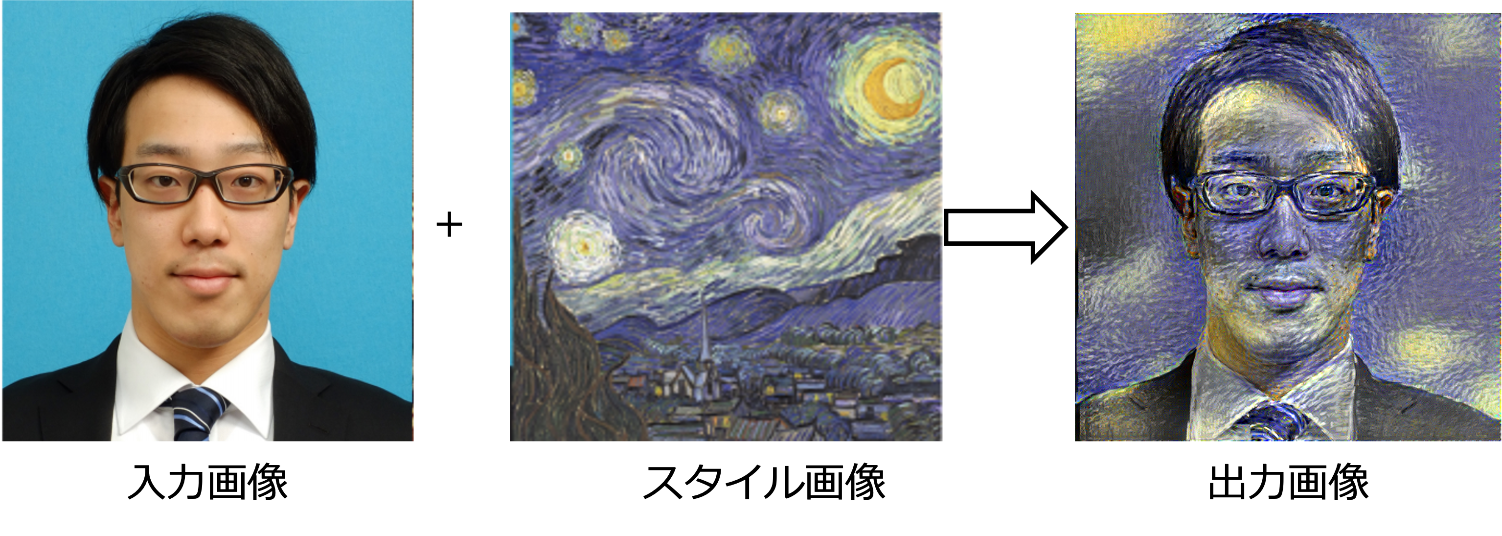 実際にこの手法を適用するとどのような結果になるのか、私の学生時代の履歴書の写真をContentとし、この手法の実行例でよく使われるゴッホの星月夜をStyleとして画像を生成した例を紹介します。