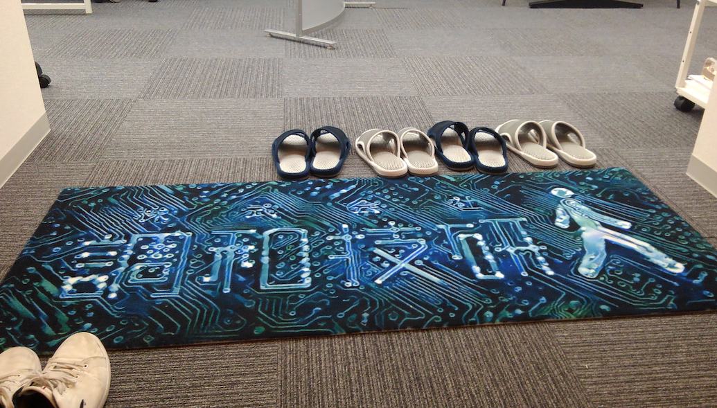 調和技研では、ロゴをContetに葛飾北斎の神奈川沖浪裏の浮世絵をStyleにして変換したデザインの玄関マットを現在も使っています。このマットは調和技研のオフィスに訪れたお客様に対して、「AI×アート」の分野も取り組んでいることのアピールや話の種になっています。ちなみに東京オフィスには調和技研ロゴと電子基盤画像をスタイルにして生成したデザインの玄関マットが置いてあります。