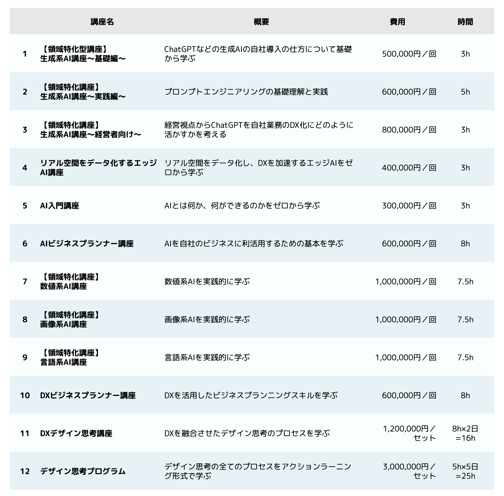 この2社共同取り組みの第一弾として、生成AIの基礎知識から幅広いAI、機械学習の理解と活用、特にChatGPT等の生成AIと各種AIソリューションを組み合わせて使いこなす実践的な教育プログラムの提供を行い、現場DXの実現を支援します。両社の強みを活かすことで現場のリアルとデジタルを融合したOMO、デジタルツィンといった、これまでにないサービスや体験までもが実現可能となるプログラムとなっております。