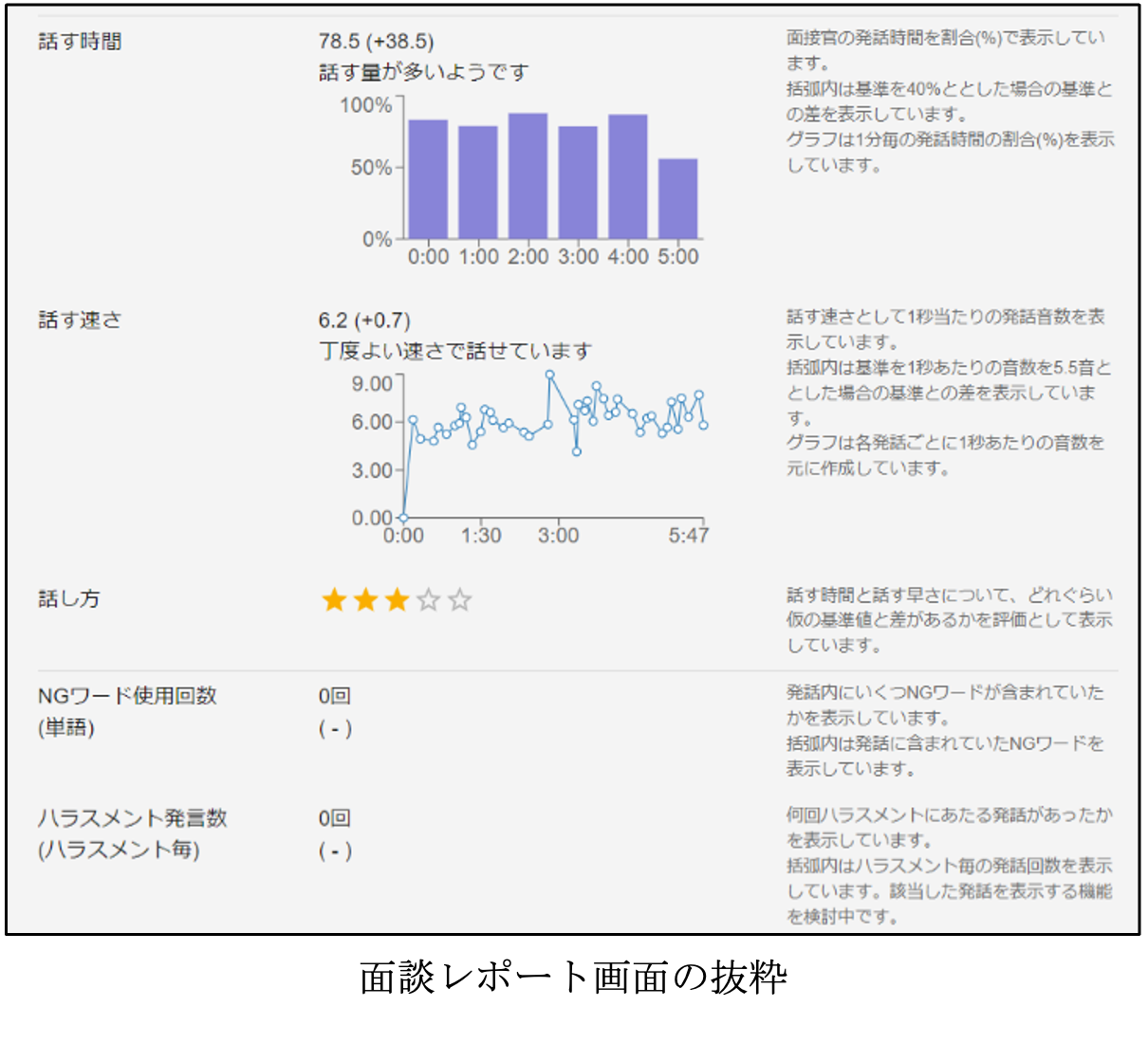 発言を文字に変換して分析することで、「喜び」「悲しみ」「驚き」など、自分の発言がどんな感情に紐づいて相手に伝わっているかがわかります。また、発言の中にハラスメントと捉えられる可能性のある内容を含んでいるかの判定もできます。