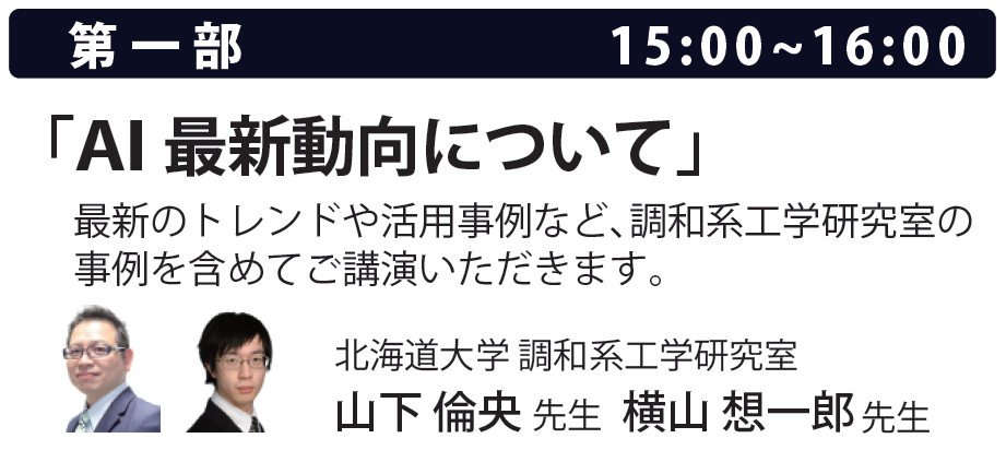 6月23日には、調和技研の技術顧問である、北海道大学 調和系工学研究室 山下先生、横山先生を招待し、「AI最新動向について」というテーマでご講演をいただきました。