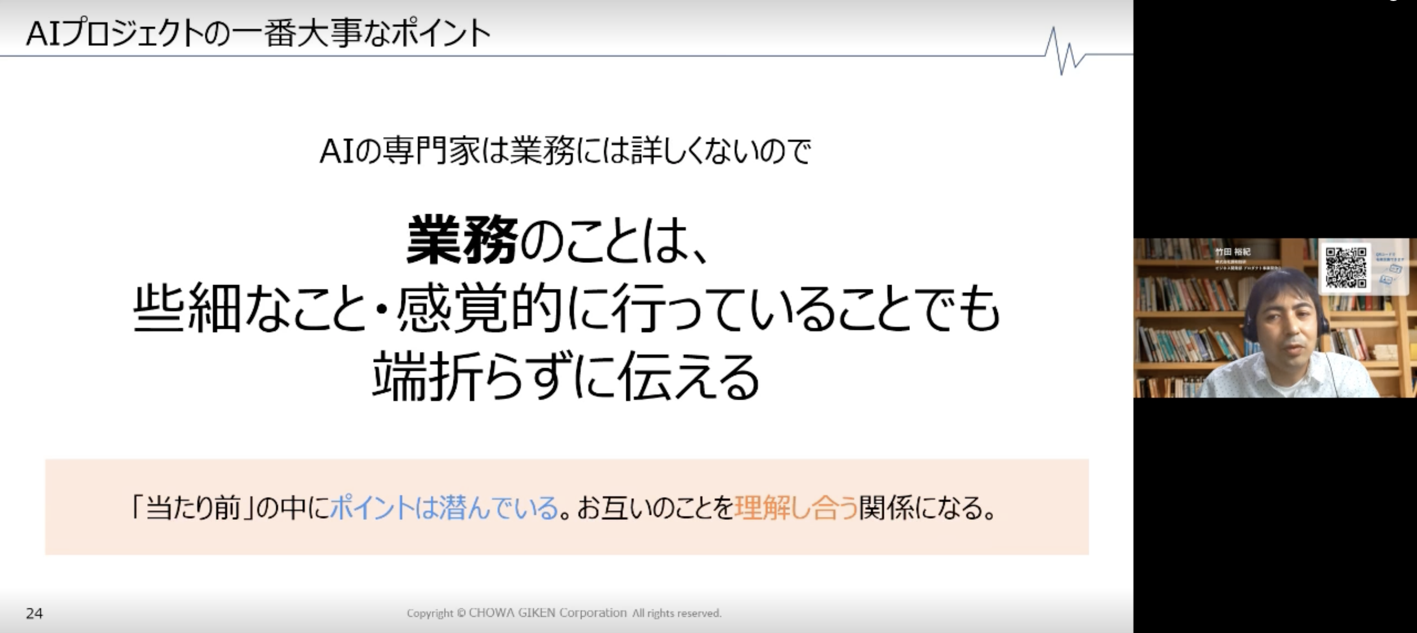 また同日に当社製造業向けAIエンジンプロダクト開発担当の竹田より、「AI導入について」というテーマでオンライン講演を実施いたしました。約140名の方にライブ視聴いただき、大盛況のうちに無事終えることができました。